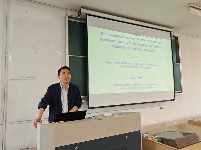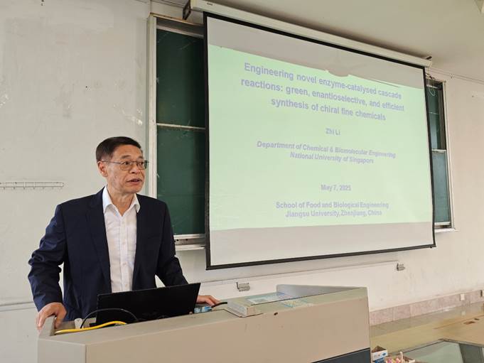On the morning of May 7, 2025, at the invitation of the School of Food and Biological Engineering at Jiangsu University, Professor Li Zhi from the National University of Singapore delivered an academic lecture titled "Engineering novel enzyme-catalysed cascade reactions: green, enantioselective, and efficient synthesis of chiral fine chemicals" in Room A301 of the main building. The lecture was hosted by Professor Zhou Cunshan, Associate Dean of the School, and attended by numerous faculty members and students. The atmosphere was enthusiastic, and the discussions were in-depth and engaging.
