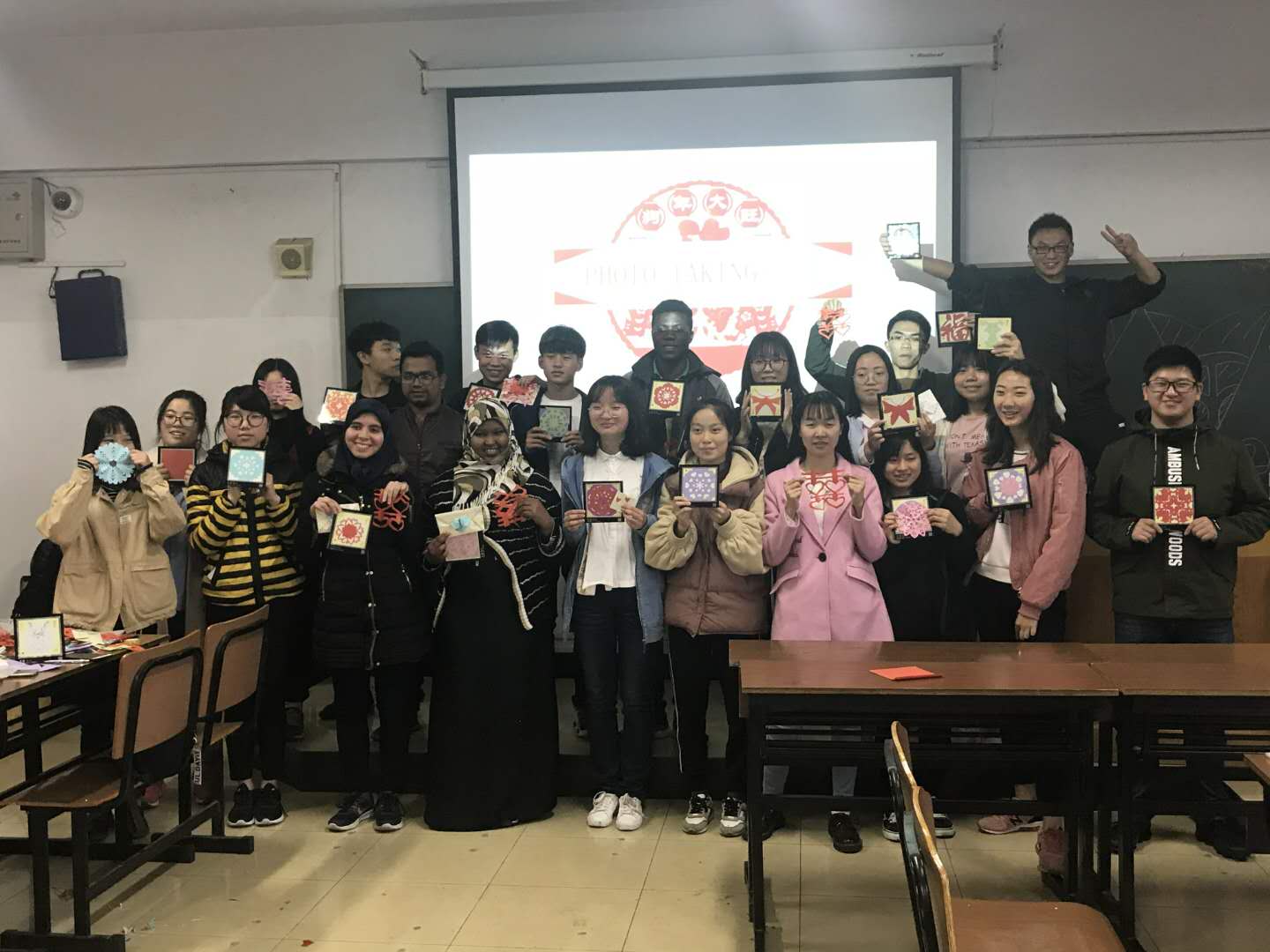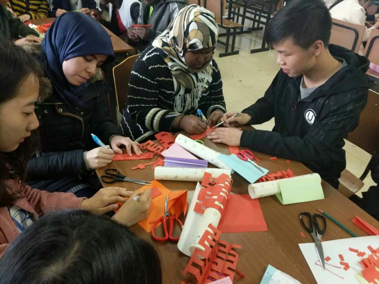 This event is based on handcrafting, The main cutting tools are simple: paper and scissors. This event was an opening gate for communication for Chinese and foreign students by exchanging their handcrafts with expressing wishes with paper cuttings and also it allows the international students to learn some simple Chinese handmade paper-cuts. A total of 17 Chinese students and 6 international students participated in the event.