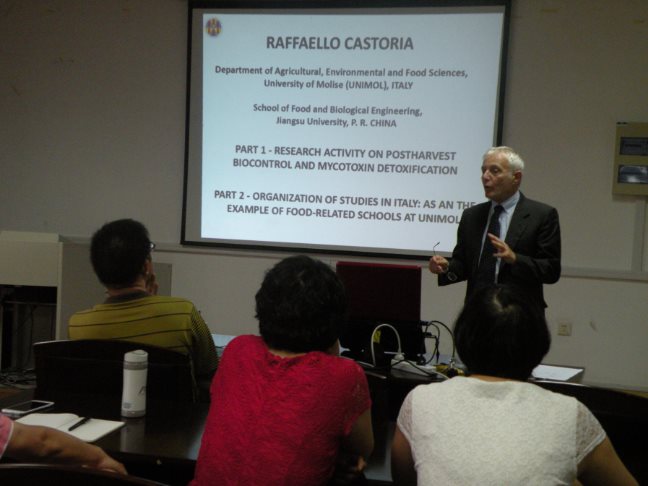 Prof. Raffaello Castoria from University of Molise visited Jiangsu University from 10 June to 14 July. Prof. Castoria delivered a series of academic lectures named Recent advancements on the detoxification of the mycotoxin patulin, Organization of Studies in Italy: Food-related schools at the University of Molise as an example and Postharvest Biological Control of major apple diseases and implications for prevention of mycotoxin contamination on July 1 and 5 respectively. Prof. Ma Haile, the Dean of School of Food and Biological Engineering, hosted the lecture, and introduced Prof. Raffaello Castoria. Prof. Castoria was appointed to the part-time professor at Jiangsu University in 2014.