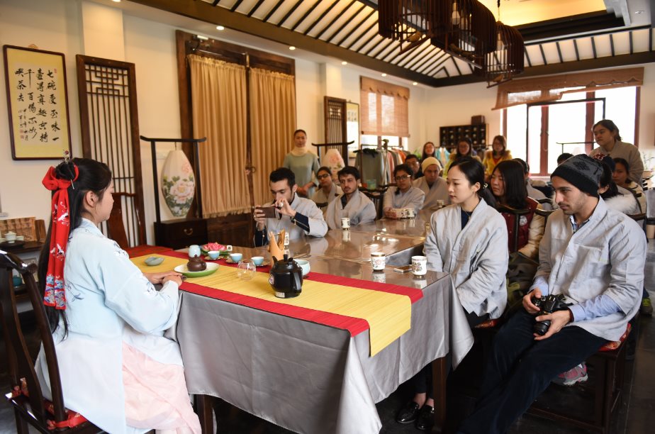 On March 13, 2016, 15 overseas students from school of Food and biological Engineering in Jiangsu University went into Tea Culture Experience Pavilion where an activity named “Chinese tea, World taste” was implemented. They experienced how to select tea sets and steep tea leaves and the etiquette of tea under the leadership of the tea specialist. They also learnt about traditional tea cultural skills such as distinguishing quality of tea and felt magic of profound Chinese culture by communicating with one another.