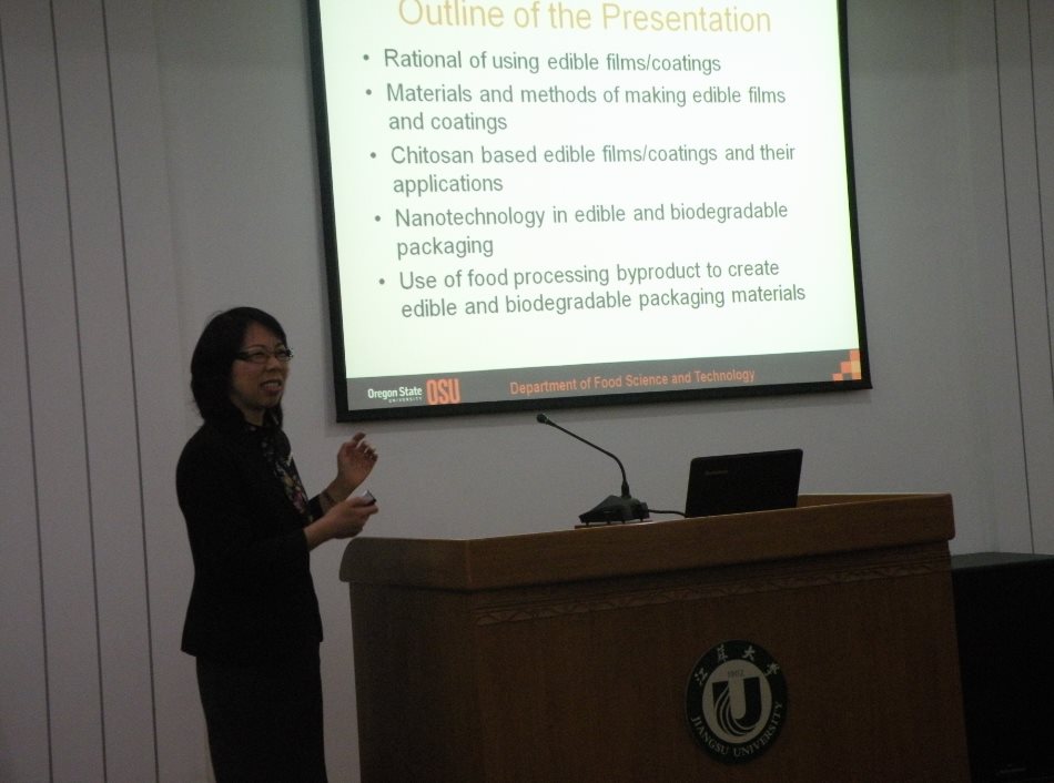 On Apr. 25, Robert McGorrin and Yanyun Zhao from Oregon State University Visited Jiangsu University.Prof. Robert McGorrin introduced Oregon State University and the Department of Food Science and Technology (FST). Prof. Yanyun Zhao delivered an academic lecture named Edible coatings and films for enhancing food quality and ensuring food safety. Ma Haile, Dean of School of Food and Biological Engineering, and some faculty members and students of the school attended the lecture.