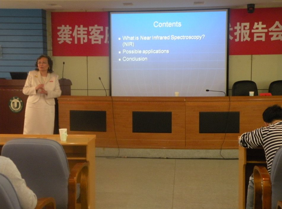 On Oct. 11, Wei G. Hansen from NIR application consulting co., LTD, was appointed part-time professor of Jiangsu University. Ma Haile, Dean of School of Food and Biological Engineering, and some faculty members and students of the school attended the ceremony. At the ceremony, Chen Long, the vice President, granted Dr. Wei G. Hanson a letter of appointment, pinned a Jiangsu University emblem for her. Dean Ma Haile made a brief introduction of Dr. Wei G. Hansen’s Curriculum Vitae and major academic achievements. After the ceremony, Dr. Wei G. Hanse made a lecture entitled the Application of Near Infrared Reflectance Spectroscopy Technique in the Food Industry.