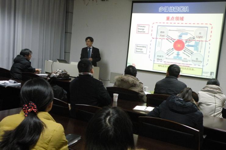 On Jan16th, Dr. Yulong Ding from UL (University of Leeds) delivered an academic lecture on the topic Energy Storage: science and technological challenges, and then, discussed with Prof Ma Haile and Prof Zou Xiaobo.