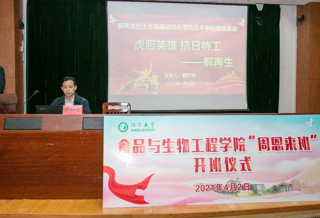 开班仪式后,招商银行镇江分行营业部副总经理解红铭做了《虎胆英雄 抗日特工——解再生》主题报告,为广大同学讲述了解再生烈士在隐蔽战线从事抗日斗争的英雄事迹,让同学们进一步学习了一名共产党员的革命斗争史。