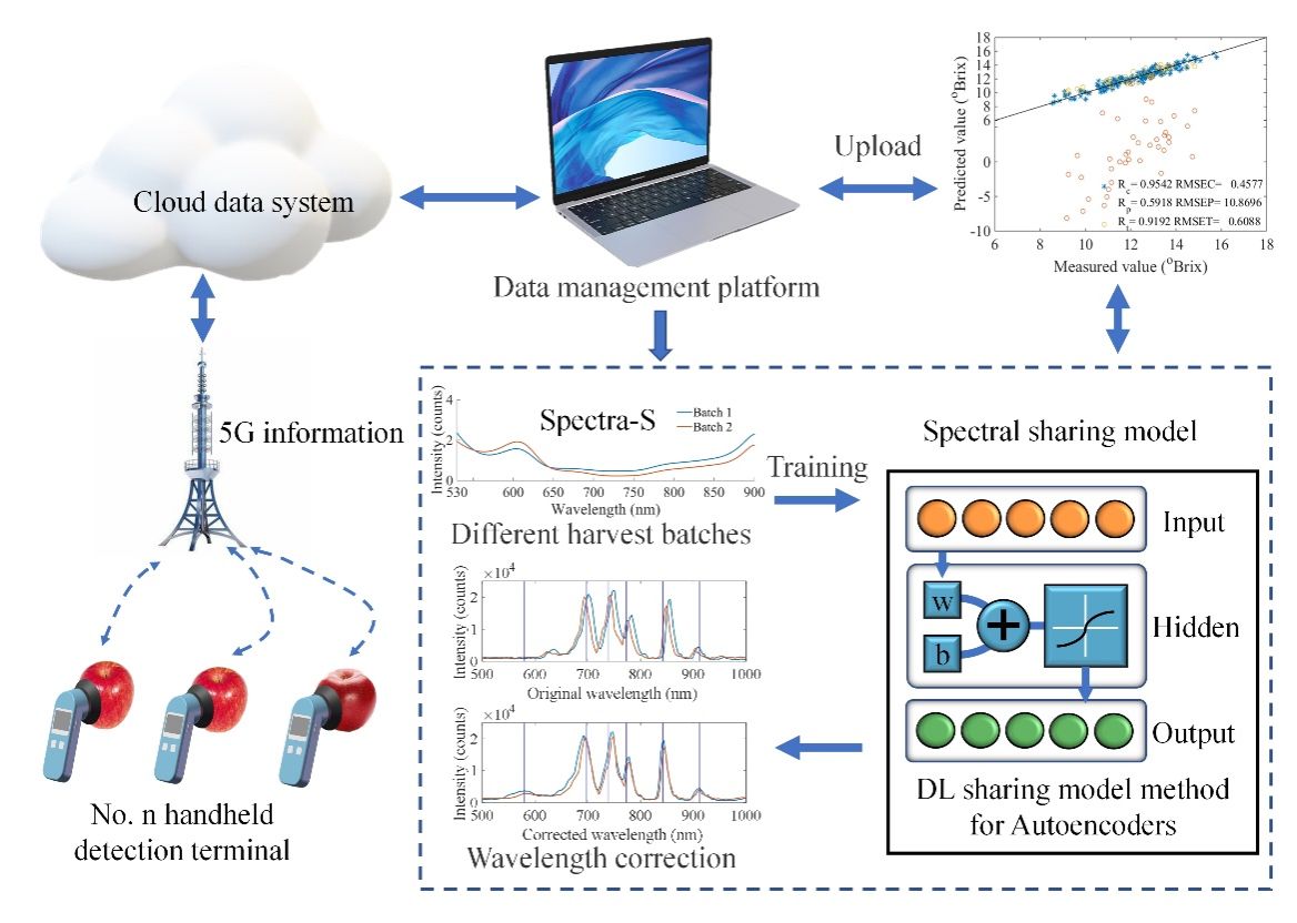 近红外光谱检测技术在食品、农产品品质检测中有着广泛应用,但检测模型传递与共享问题成为该技术推广应用的瓶颈。本研究利用近红外传感、深度学习、物联网和云服务技术,以苹果为代表实现了食品主要食用品质检测模型的智能共享和远程更新评价。研究团队构建了一种基于近红外光谱和深度学习技术的模型传递共享方法和物联网监测评价系统。为此,研发了低功耗手持式网络化果品质量无损检测终端和交互式云数据系统的模型共享与更新平台。在此基础上,研究团队开发了自编码器神经网络建立光谱传递模型,用于光谱校正和模型共享。研究结果表明,该自编码器神经网络在光谱校正方面表现优异,有效消除了设备台间差,显著降低了不同检测终端对近红外光谱检测准确性的影响。该研究突破了近红外光谱检测的模型传递与共享关键技术,为近红外光谱检测技术在食品农产品检测领域的规模化应用提供了有效的解决方案。