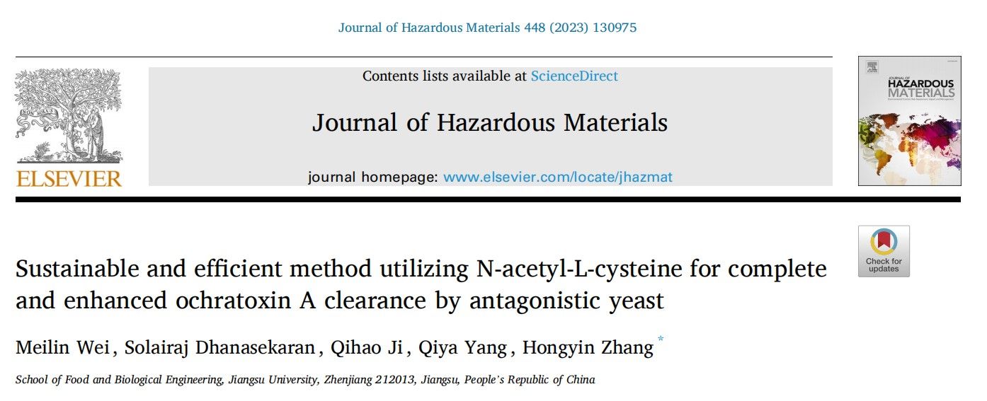 张红印教授团队在国际顶级期刊Journal of Hazardous Materials(中科院一区)发表题为“Sustainable and efficient method utilizing N-acetyl-L-cysteine for complete and enhanced ochratoxin A clearance by antagonistic yeast”的研究论文(2023,448,15),研究了抗氧化剂N-乙酰-L-半胱氨酸对隐球酵母Y3降解赭曲霉毒素A的促进作用以及对酵母自身代谢的影响。海角网