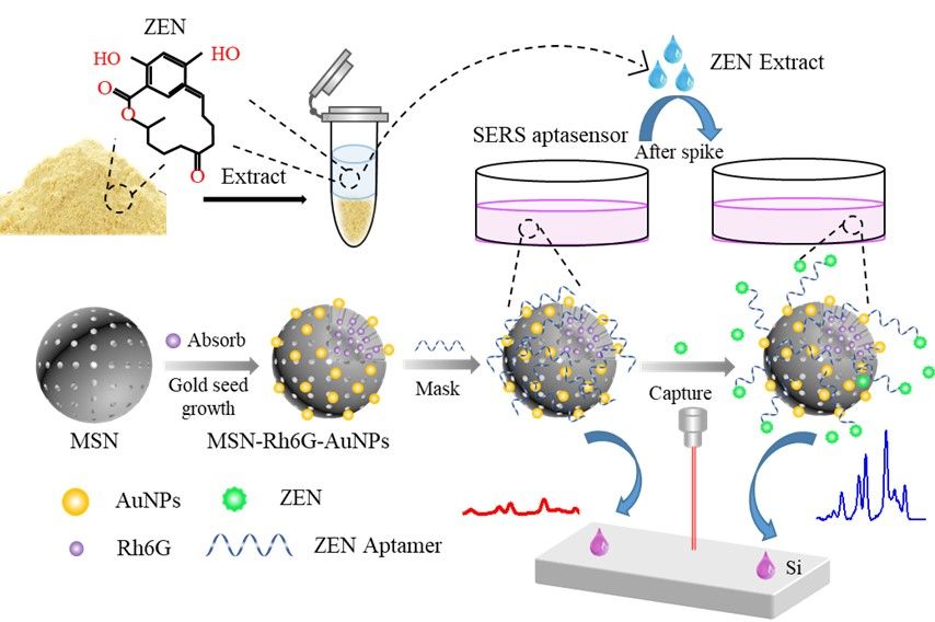 本研究利用介孔二氧化硅的强负载力将拉曼信号分子罗丹明6G (Rh6G)吸附在孔穴中,然后对硅球表面进行氨基化修饰并生长金纳米颗粒(AuNPs),构建硅-金复合拉曼增强基底,再进一步修饰ZEN适配体实现对目标物的特异性捕获以及拉曼信号调控的双功能。所构建的MSN-Rh6G-AuNPs 纳米复合材料结合适配体调控的新型SERS适配体传感器可以实现ZEN的快速、高灵敏检测。该方法所构建的适配体传感器结构简单,检测过程无需使用昂贵的净化柱,检测时间短、效率高且所用材料生物友好。