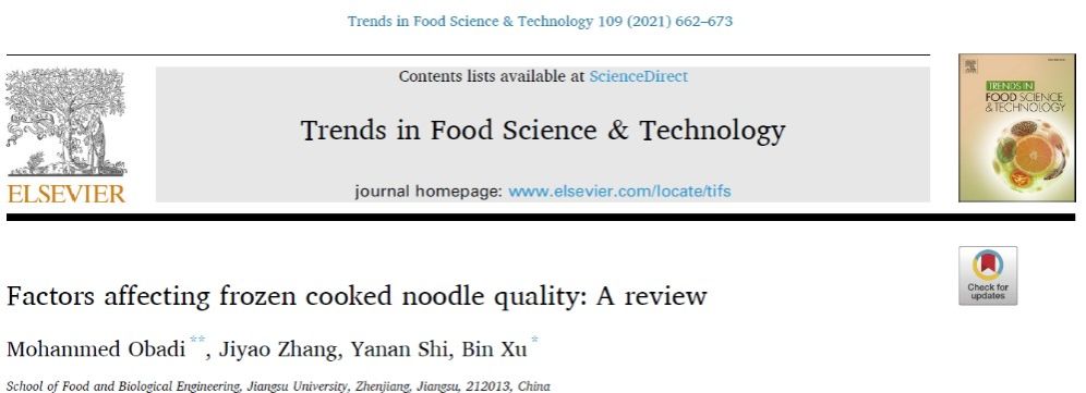 徐斌教授课题组标题为“Factors affecting frozen cooked noodle quality: A review”(影响冷冻熟面品质的因素:综述)的综述文章在国际食品领域TOP期刊(No.1)《Trends in Food Science & Technology》发表。海角网