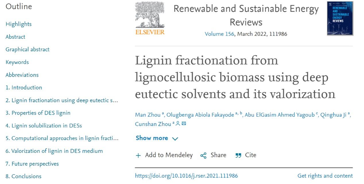 周存山教授果蔬加工课题组标题为“Lignin fractionation from lignocellulosic biomass using deep eutectic solvents and its valorization”的综述文章在国际绿色可持续发展技术领域TOP期刊《Renewable and Sustainable Energy Reviews》在线发表(//doi.org/10.1016/j.rser.2021.111986)。