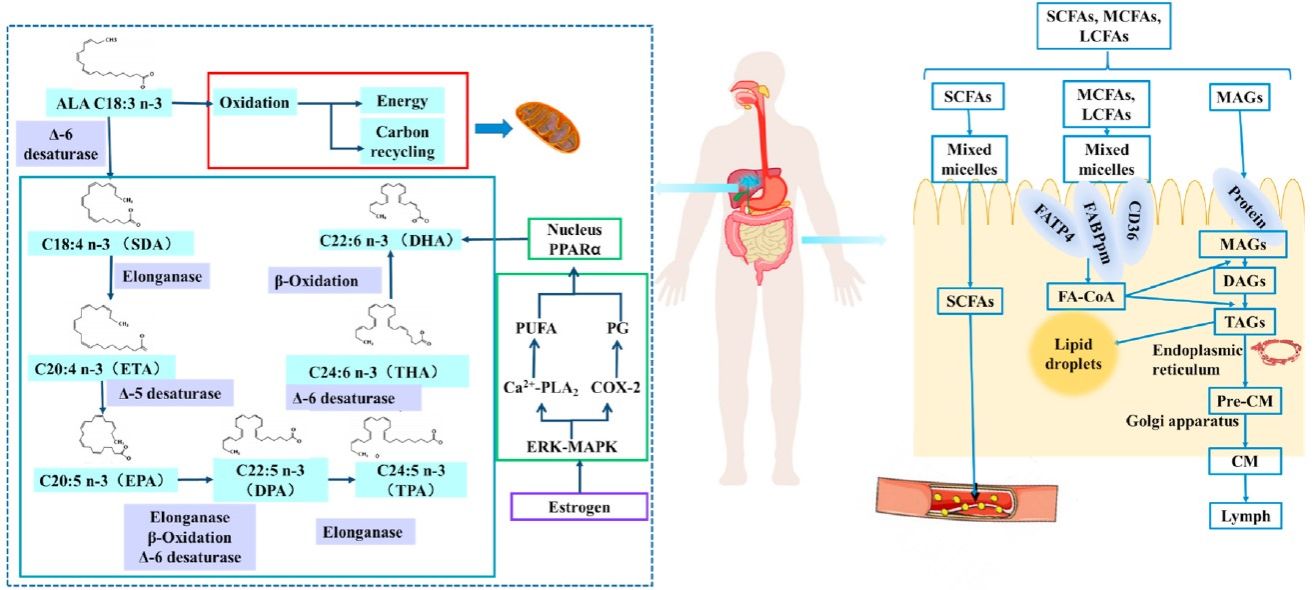 图2 a-亚麻酸(ALA)生物合成转化EPA和DHA的途径及膳食脂质的肠道吸收过程