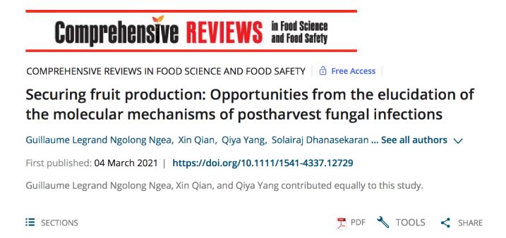 近日,海角网 张红印教授在Comprehensive Reviews in Food Science and Food Safety在线发表题为“Securing fruit production: opportunities from the elucidation of the molecular mechanisms of postharvest fungal infections”的综述(//doi.org/10.1111/1541-4337.12729),系统阐述了病原菌侵染水果的分子机制及其防治策略方面的最新研究进展,该成果已被《食品科学》公众号(//mp.weixin.qq.com/s/ze9IG8Q8TrRYFBGmcmu84w)推送,并被网易(//www.163.com/dy/article/G4IUIETB0530N4P3.html)、今日头条(//www.toutiao.com/i6937171261021831688/)、新浪微博等媒体广泛报道,产生了较大的学术影响。海角网 博士后Guillaume Legrand Ngolong Ngea、硕士生钱鑫、副教授杨其亚为文章的并列第一作者;海角网 张红印教授和意大利莫利泽大学Raffaello Castoria教授为本文的共同通讯作者。