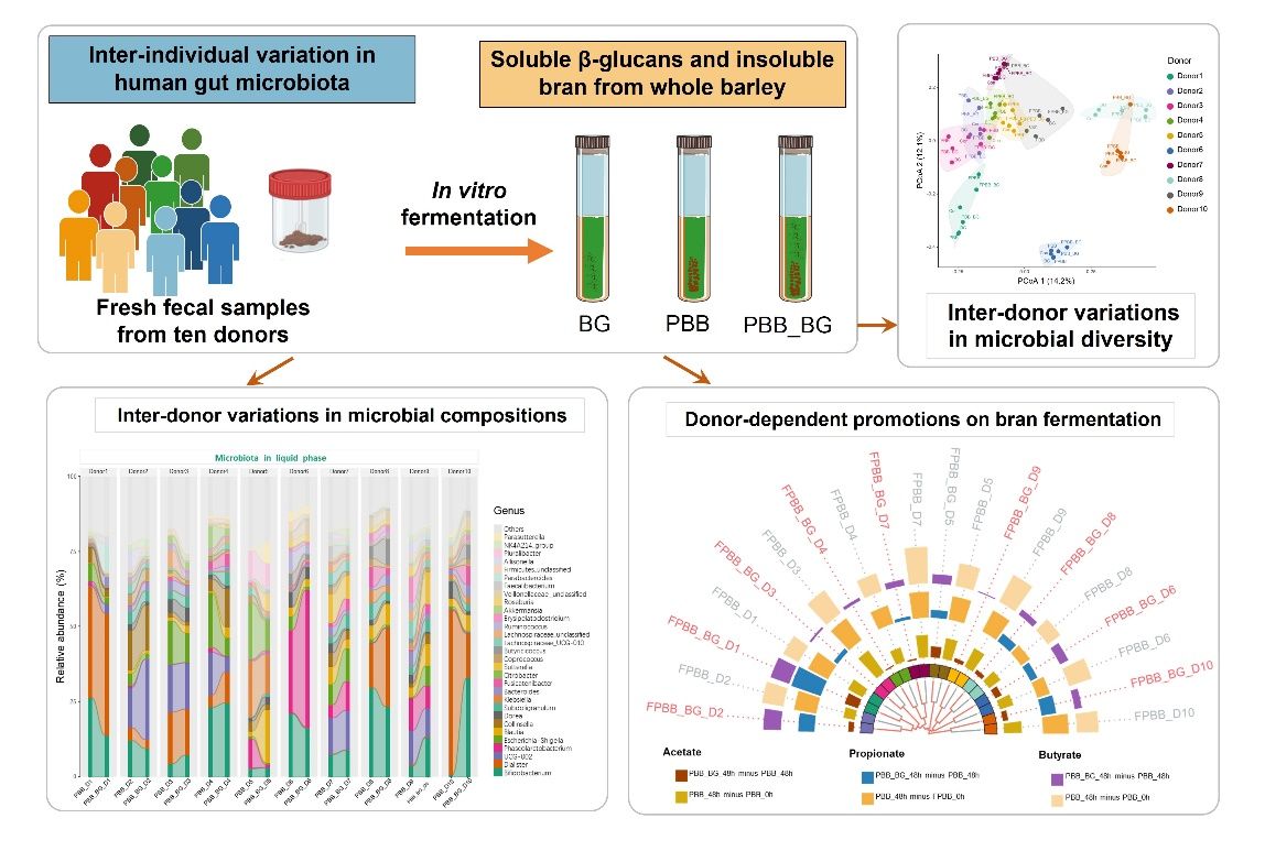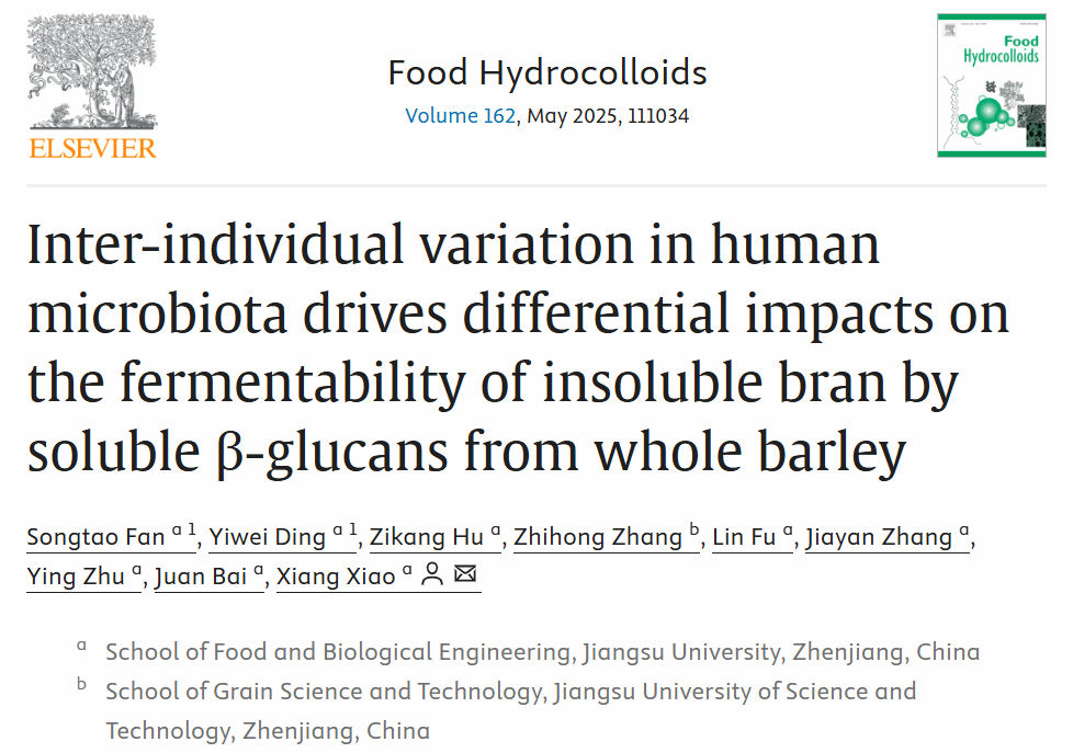 肖香教授、范松涛讲师在在国际Top期刊《Food Hydrocolloids》(Q1,IF2023:11.0)上发表论文“Inter-individual variation in human microbiota drives differential impacts on the fermentability of insoluble bran by soluble β-glucans from whole barley”。海角网