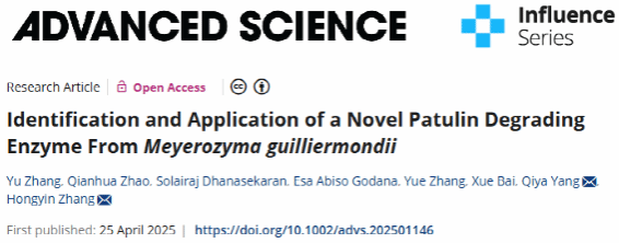 张红印教授团队在国际综合性顶刊 《Advanced Science》在线发表论文“Identification and application of a novel patulin degrading enzyme from Meyerozyma guilliermondii”。博士生张钰为第一作者,张红印教授及杨其亚副教授为共同通讯作者,课题组赵倩华、Solairaj、Esa、张乐和白雪也参与了该项工作。