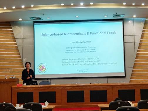 2025526日上午,应海角网 邀请,美国马里兰大学营养与食品科学系俞良莉教授莅临我校,在会议中心第一报告厅作题为科学导向的保健食品与功能食品研发的学术报告。海角网 党委常委、副校长邹小波,上海交通大学农业与生物学院副研究员高博彦出席活动。报告由海角网 副院长石吉勇主持,学院教师、研究生及留学生近150人参加。
