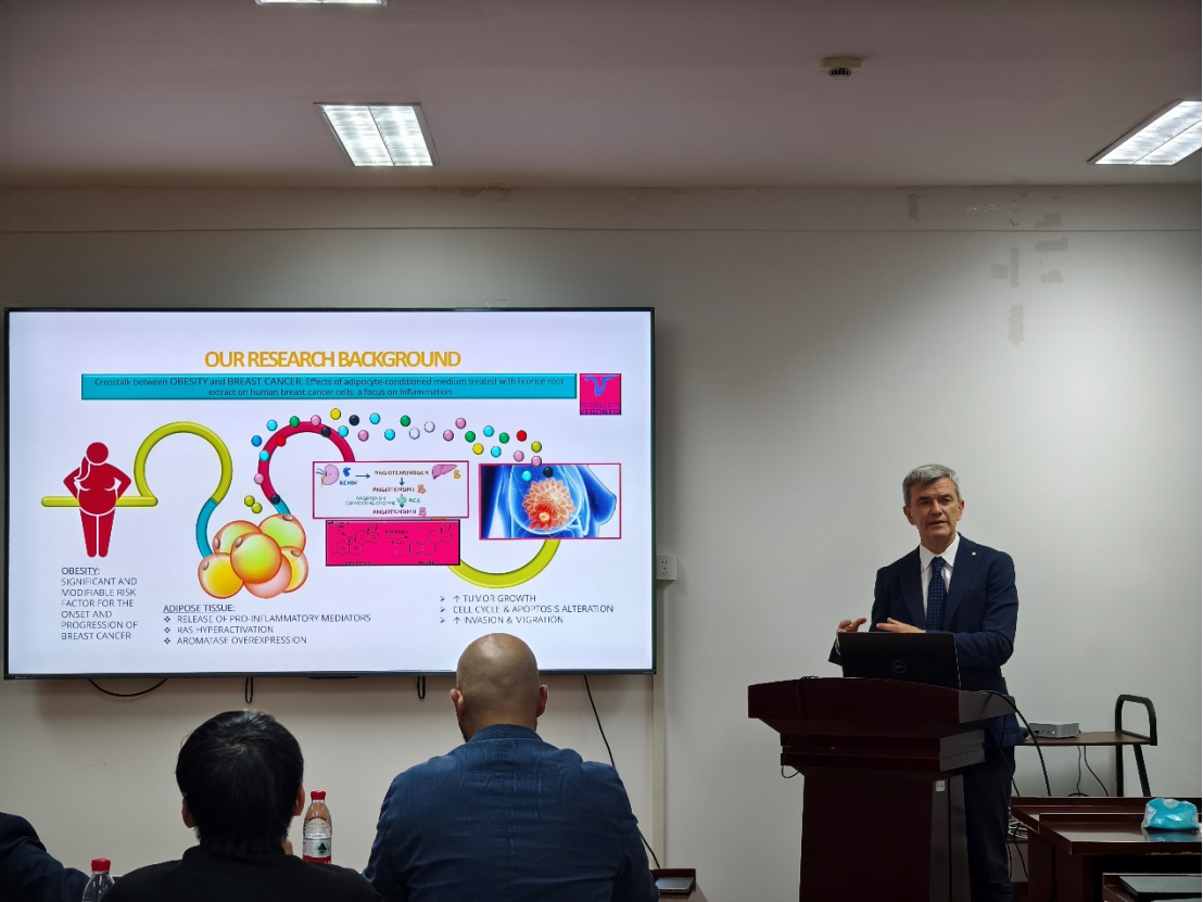 Battino教授是国际食品生物化学与营养科学领域的权威学者,拥有三十余年科研经验,主要研究方向为生物能学、食品科学及天然抗氧化物的功能机制。在报告中,Battino教授深入阐述了生物活性化合物在肥胖及相关疾病中的潜在调控作用。他指出,营养学的基础研究是一项充满挑战的长期任务,其核心目标之一是为临床疾病治疗提供可靠的科学证据。肥胖及肥胖相关癌症等复杂疾病,除药物干预外,更需要新的膳食策略来改善患者生活质量并延长寿命。Battino教授特别介绍了其团队关于生物活性化合物影响脂肪细胞分化过程的研究成果。该过程涉及前脂肪细胞向成熟脂肪细胞的转化,而调控该机制有助于理解肥胖形成的分子基础。他还分享了脂肪组织释放的脂肪因子(adipokines)与肿瘤细胞之间相互作用的最新研究进展,并探讨了部分生物活性化合物在调节代谢和防治肥胖相关疾病中的潜在应用。